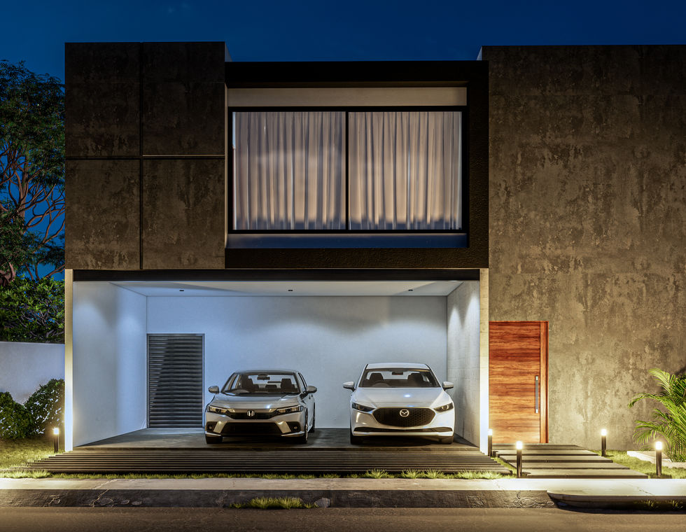 Casa de lujo de dos pisos estilo minimalista, con una fachada única y iluminación creativa y distintiva. Cuenta con amplias áreas de descanso al aire libre, piscina y un diseño de concepto abierto con acabados de alta calidad, que combina elegancia, confort y estilo contemporáneo en cada espacio.